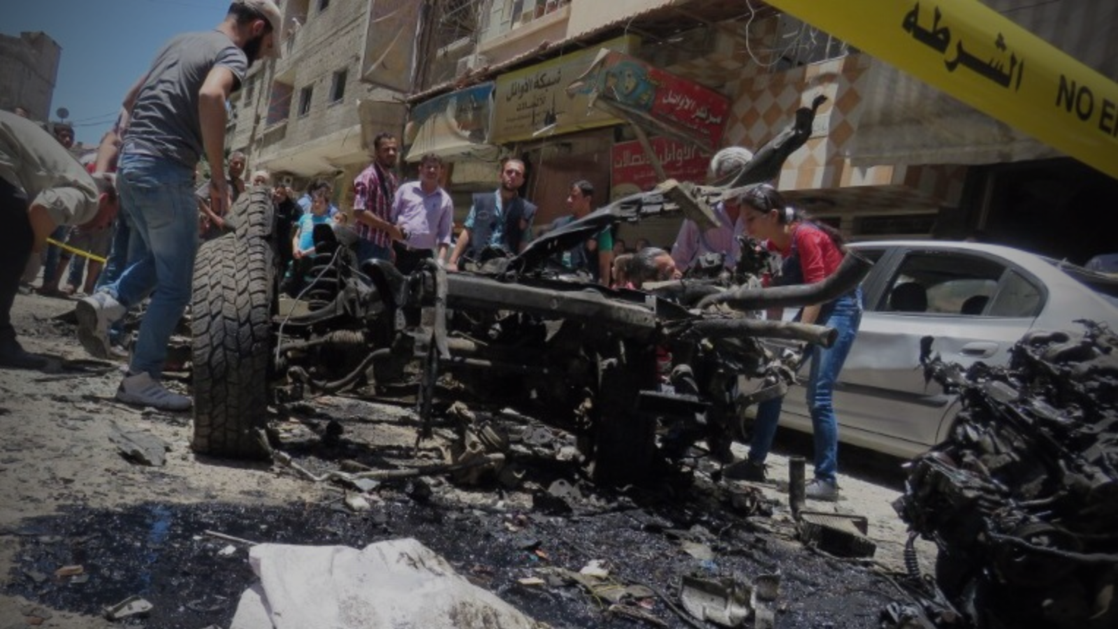 Charred taxi surrounded by large crowds